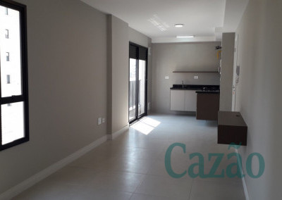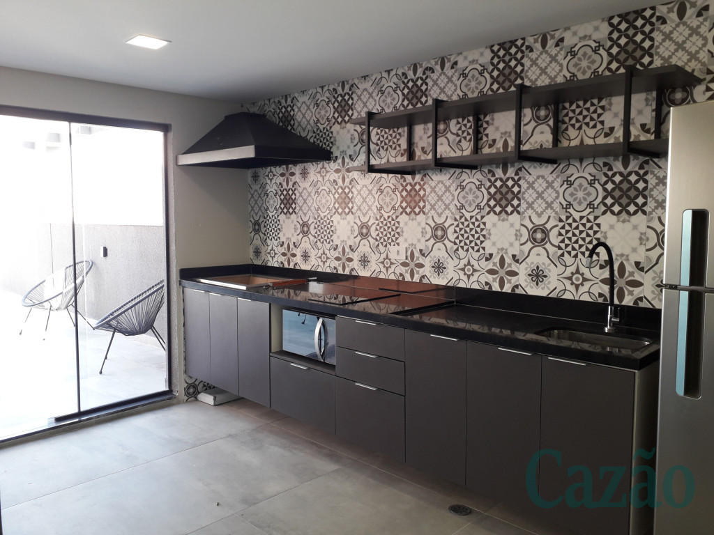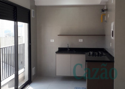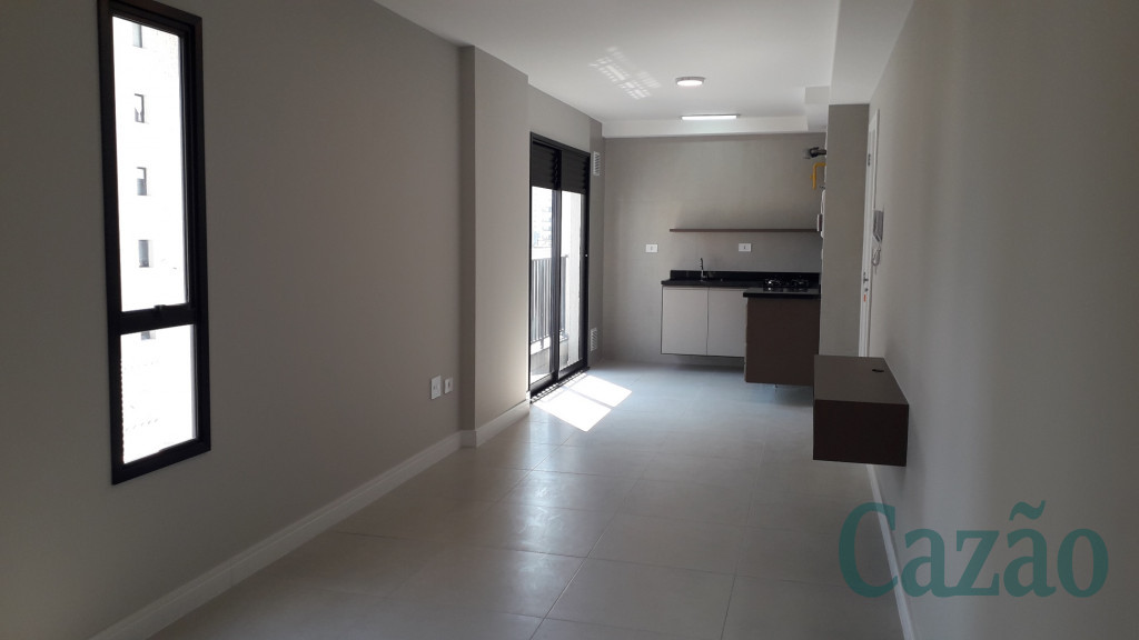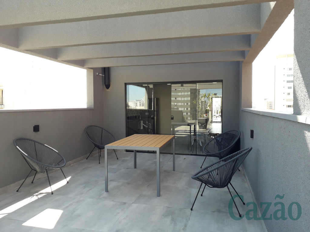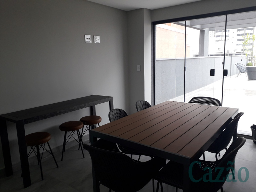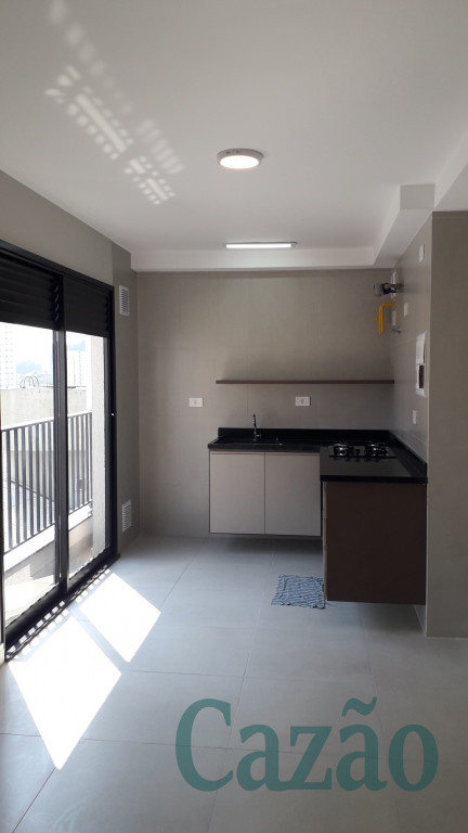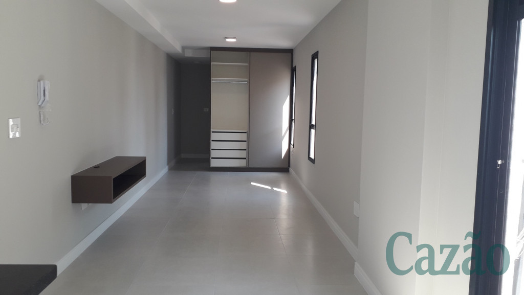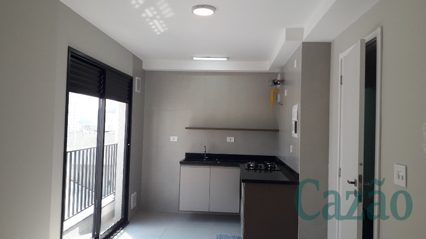 Studio arejado e ensolarado, possui 34 m², piso em porcelanato, cozinha em L com bancada em granito, sacada, vaga de moto.